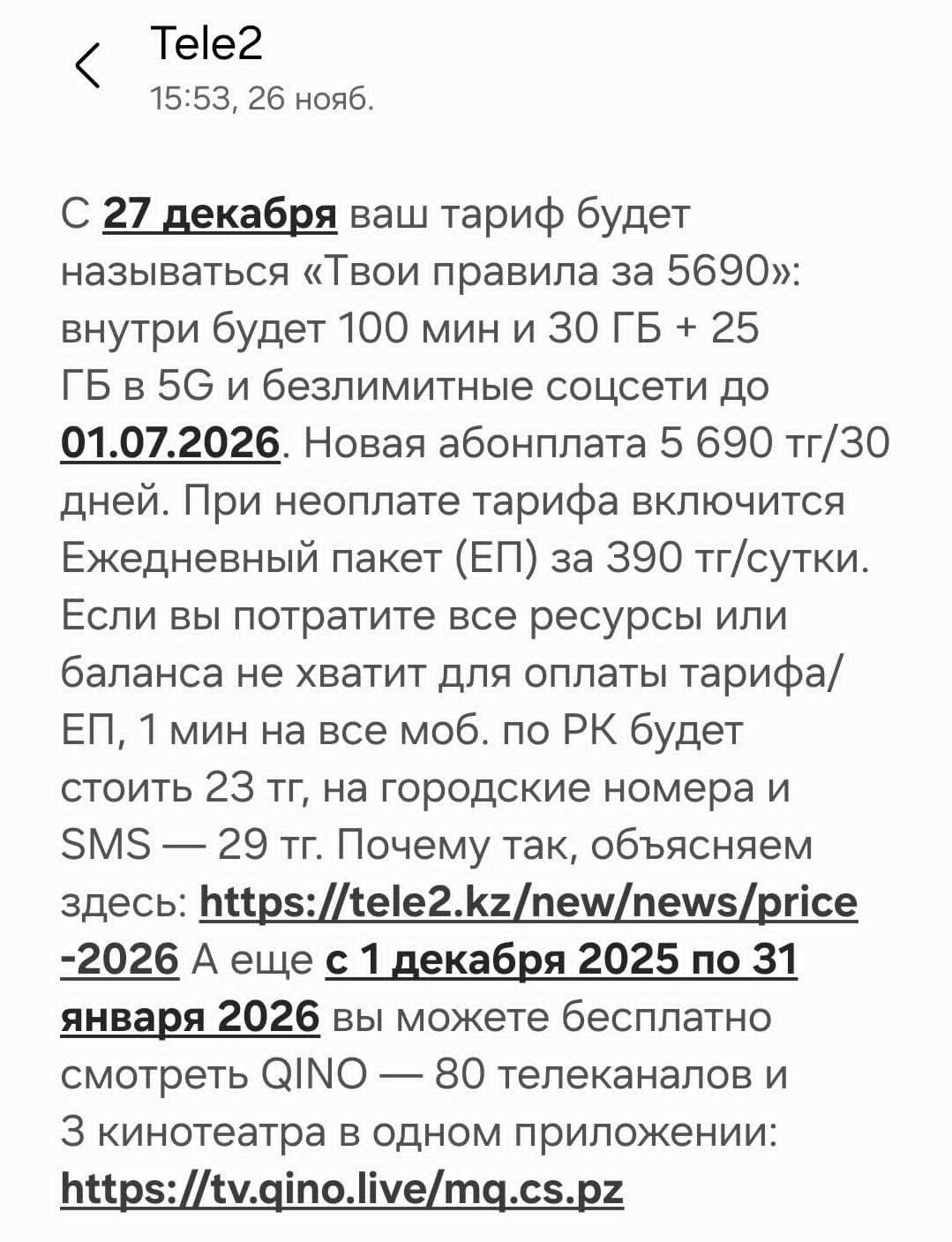 Казахстанцы жалуются на повышение стоимости услуг мобильных операторов, передает Arnapress.kz. Семейчане отправляют к нам в редакцию и публикуют в соцсетях скриншоты сообщений от мобильных операторов, где абонентов уведомляют о том, во сколько теперь будет обходиться тот или иной тариф.