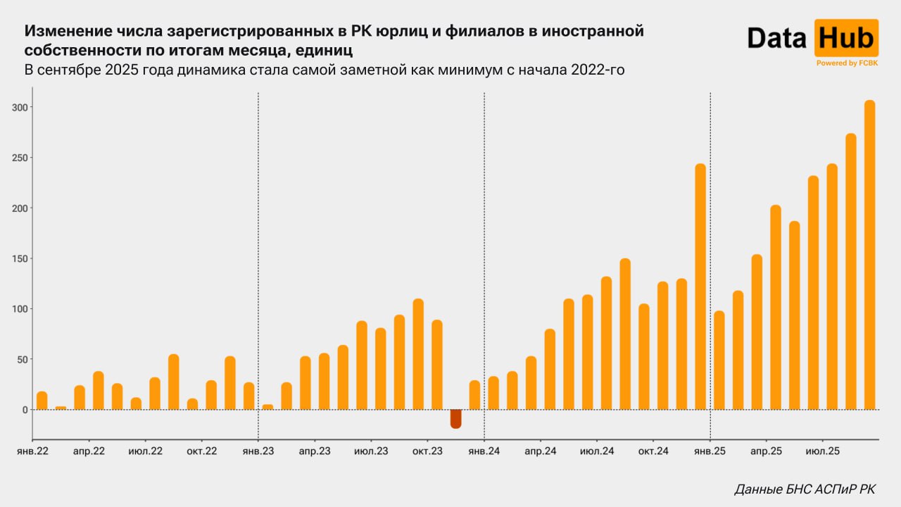 С 1 сентября по 1 октября число зарегистрированных юрлиц/филиалов с китайскими собственниками увеличилось на 307 единиц, до 7,1 тысячи. Это максимальный месячный прирост по крайней мере с января 2022 года, то есть за более чем 3,5 года, передает Arnapress.kz со ссылкой на Telegram-канал DATA HUB.