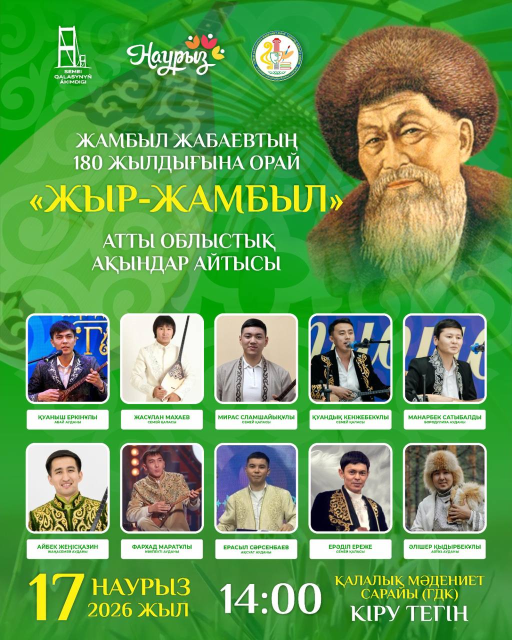 Посетить айтыс в честь 180-летия Жамбыла Жабаева приглашают семейчан