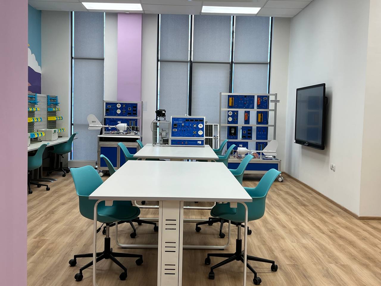 В научно-техническом блоке размещены лаборатории для занятий робототехникой, программированием и естественными науками, включая авиамоделирование и VR-кабинет.