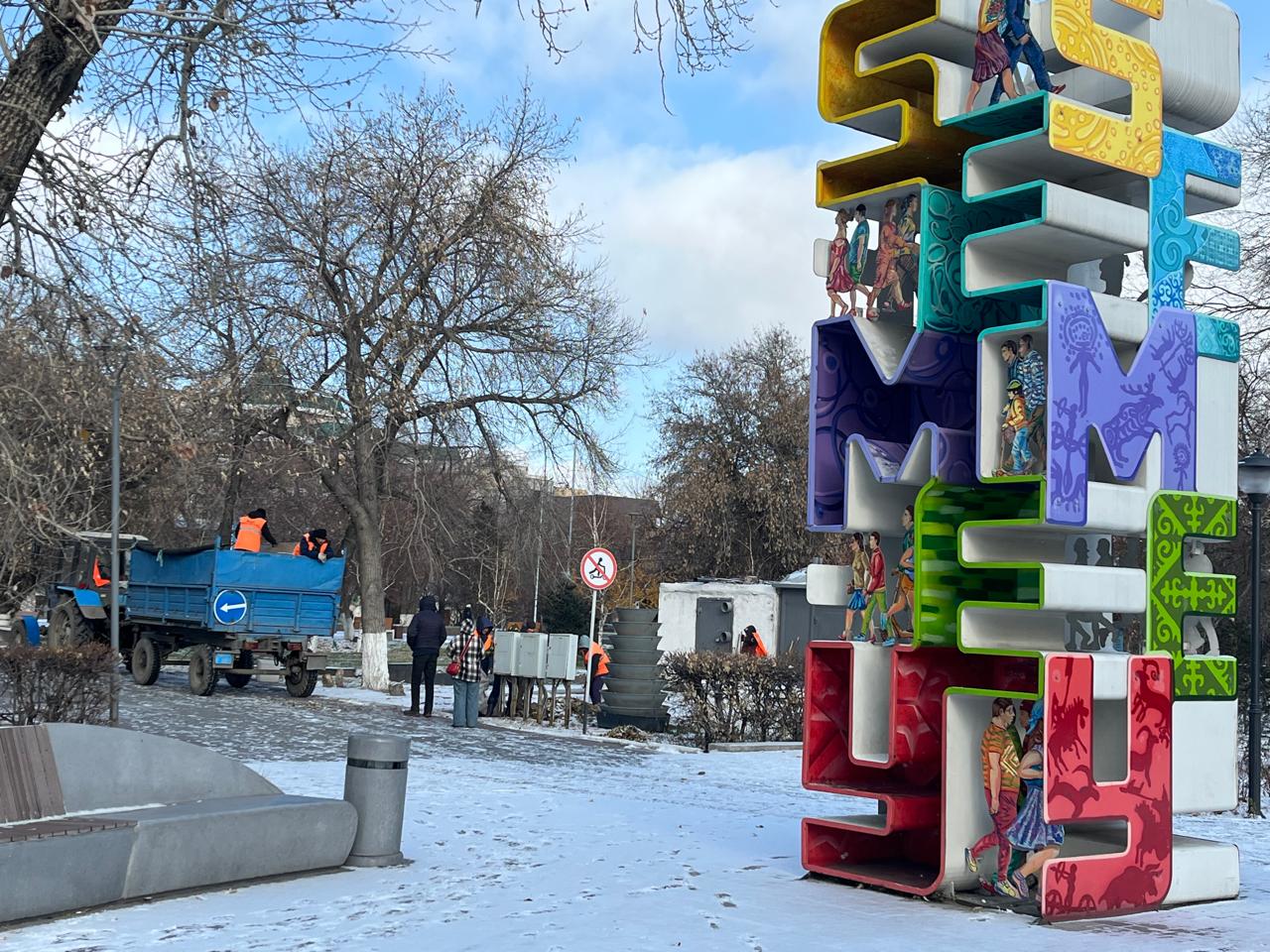 А в половину десятого утра автобус доставил трудовой десант с бригадой сотрудников ТОО "Зеленстрой Семей", которые направились работать в сквер Победы. Там убирали не только снег, но и накопившиеся за осень опавшие листья.