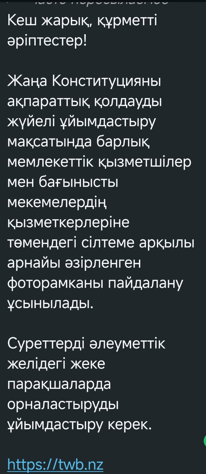 В редакцию Arnapress.kz поступил сигнал о том, что сотрудникам сферы культуры в Семее в рабочих чатах предлагают установить в социальных сетях аватарки в поддержку нового проекта Конституции.