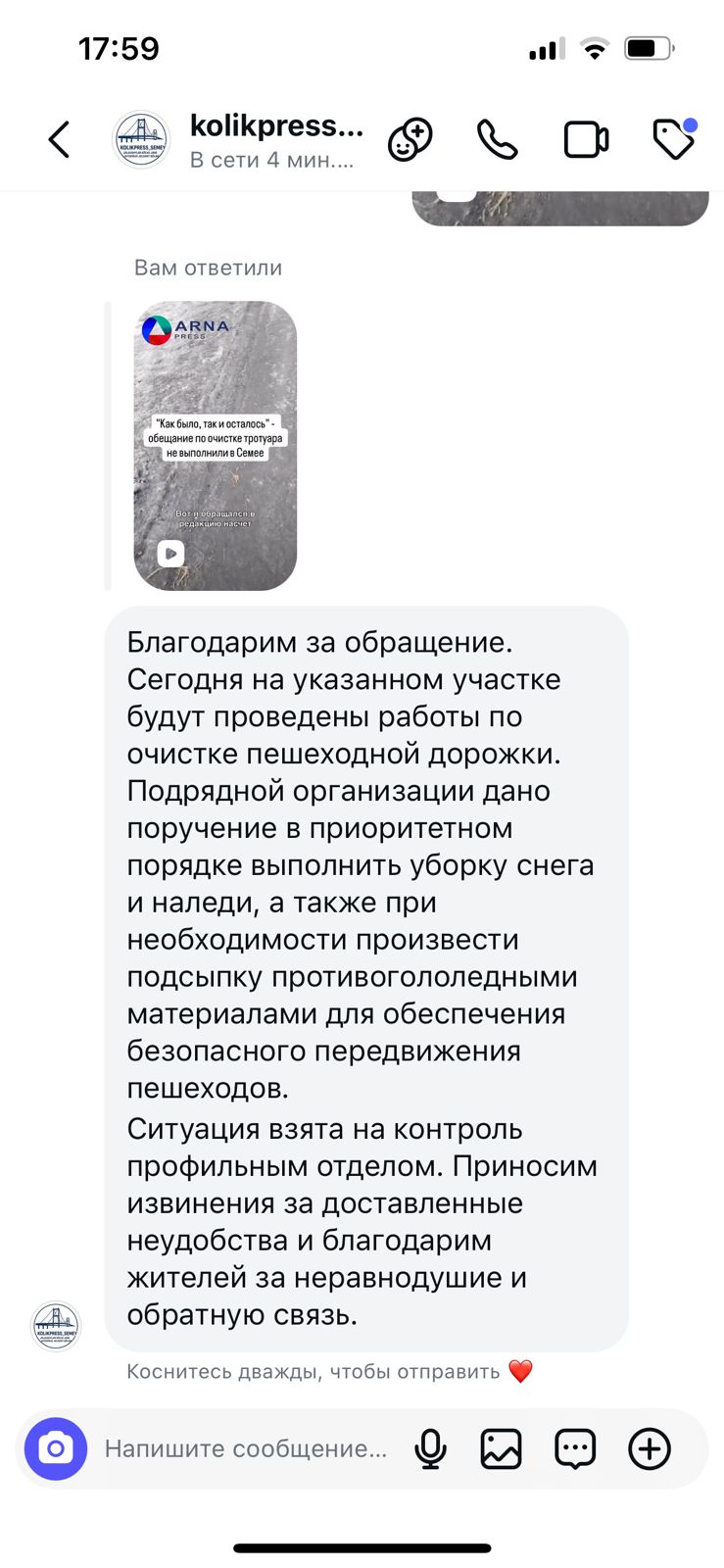 Уже после этой публикации в соцсетях отдел транспорта и автодорог вновь оставил ответ, где пообещал очистить пешеходную дорожку сегодня и по необходимости произвести там подсыпку противогололедными материалами.
