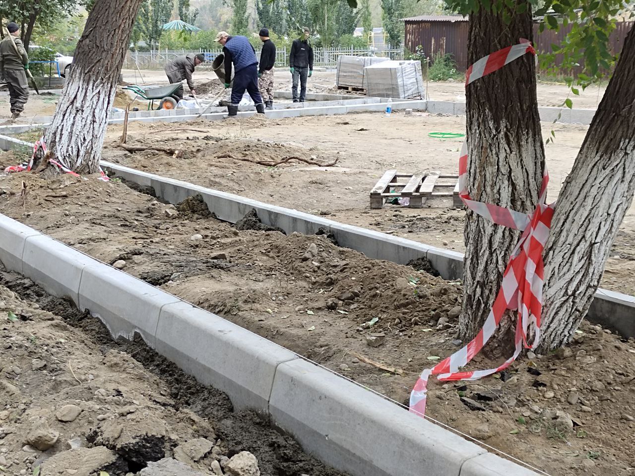 На момент посещения территория находилась на начальном этапе благоустройства: установлены бордюры, ведется подготовка площадок – рабочие разравнивали и засыпали песком будущие игровые зоны.
