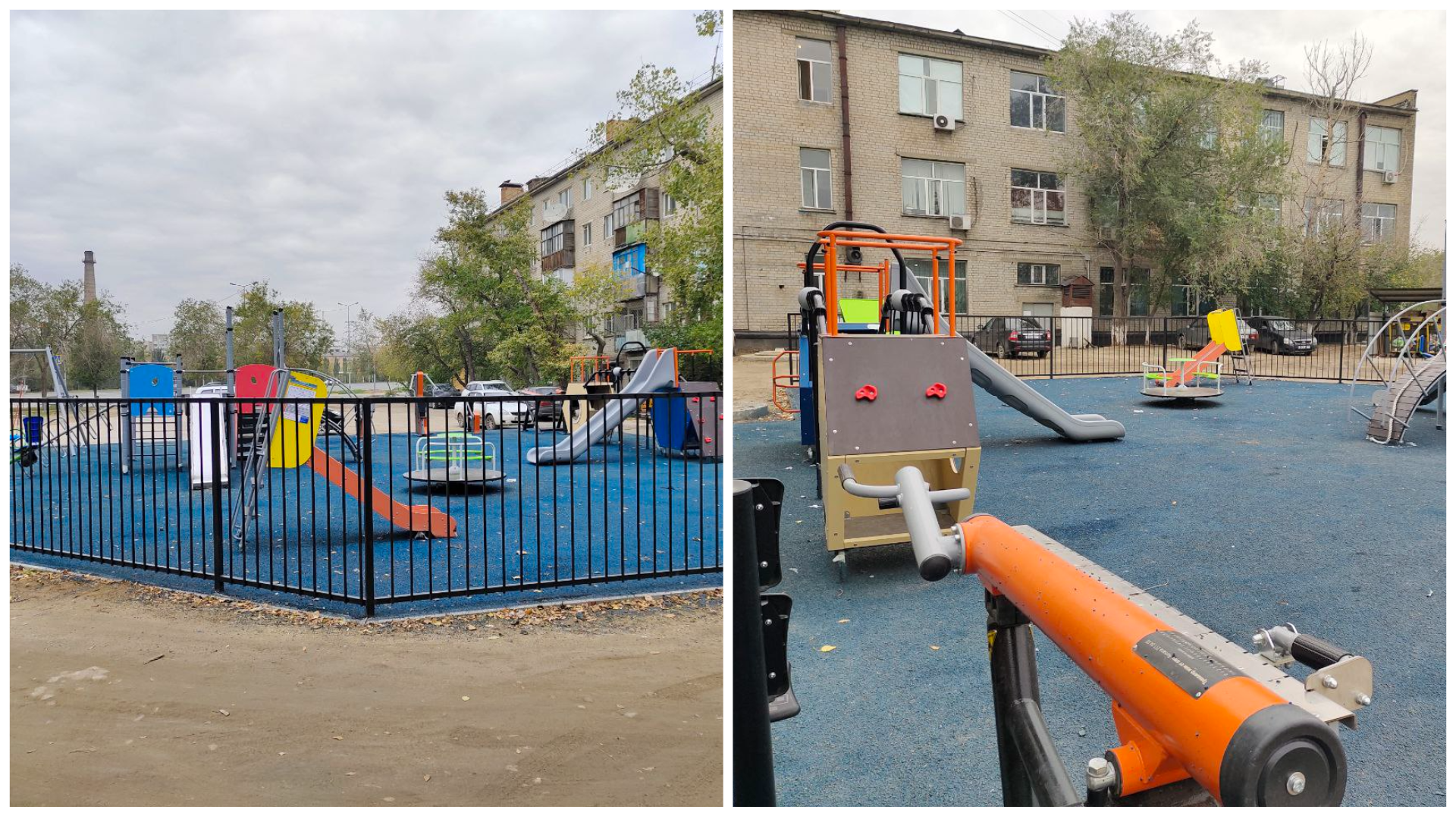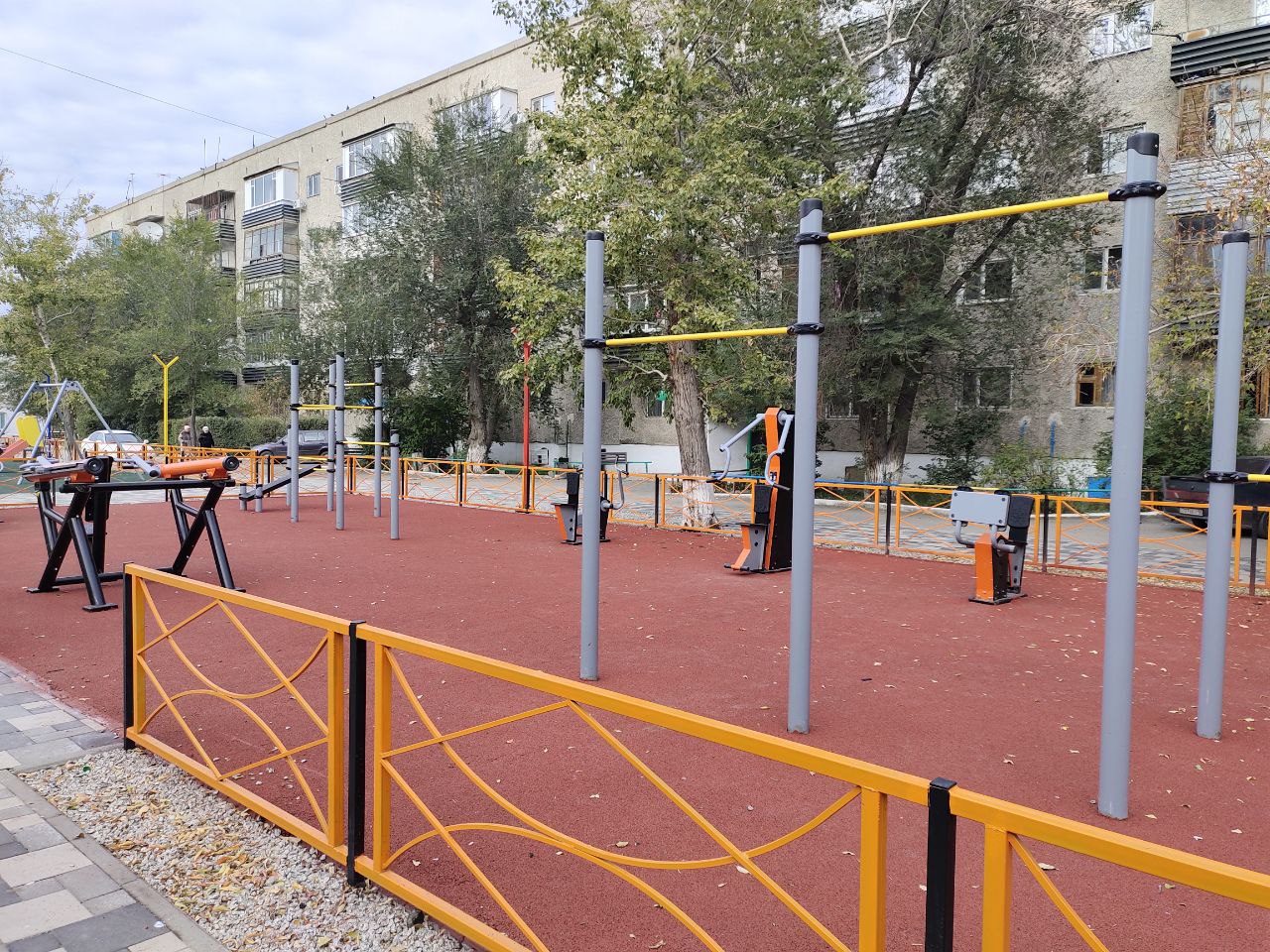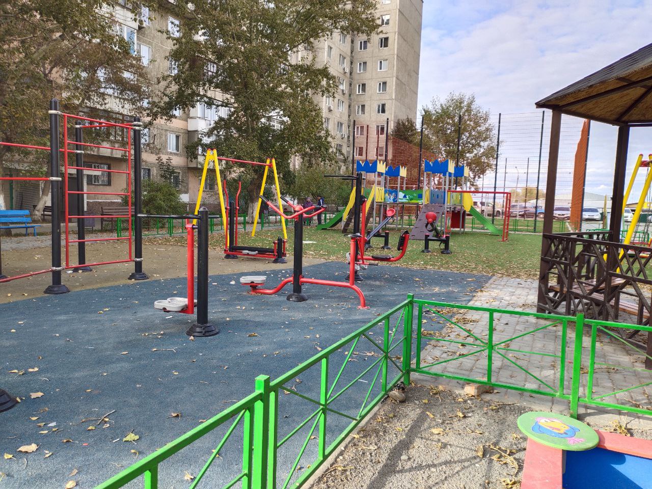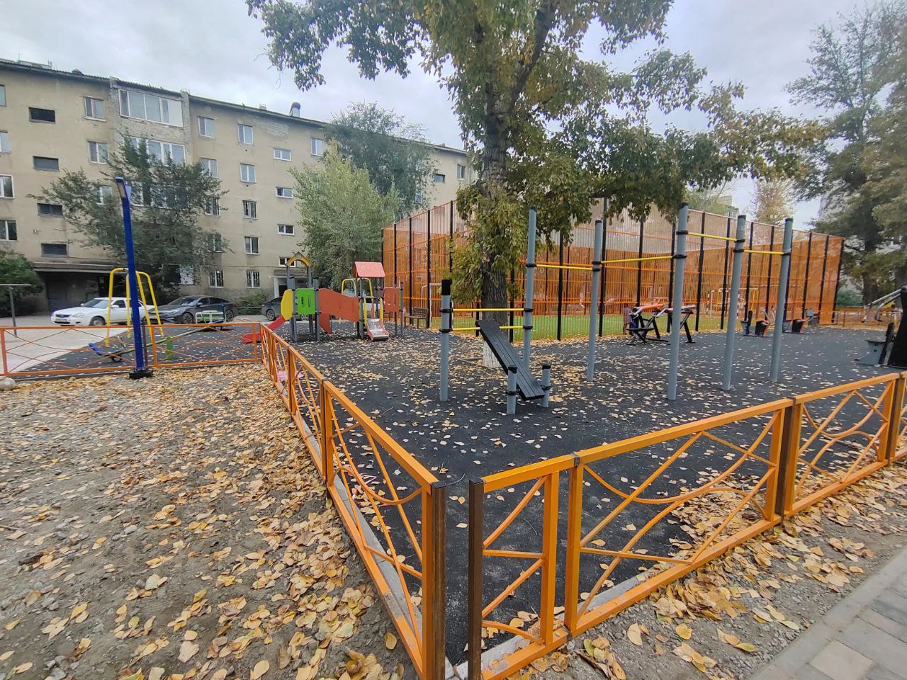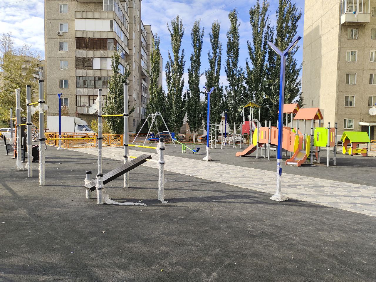 Здесь благоустройство уже завершено. Во дворе установлены детская площадка с качелями и горками, а также спортивные снаряды. Площадка огорожена, чтобы играющие дети не выбегали на проезжую часть. Элементы смонтированы аккуратно, оборудование прочное и устойчивое, без видимых повреждений и торчащих болтов.