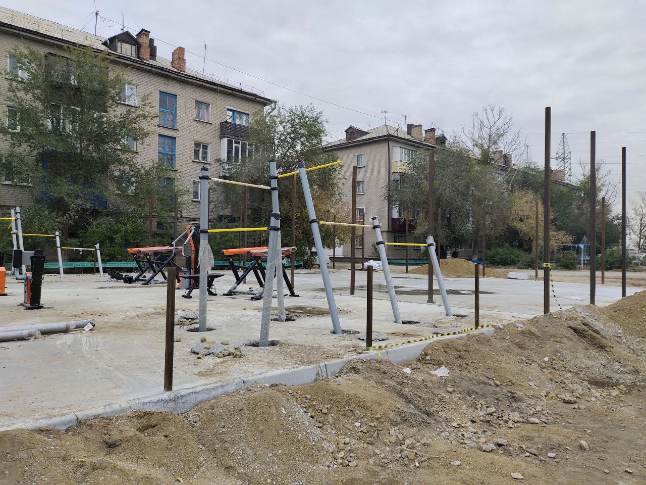 Во дворе установлены бордюры и залито бетонное основание. По словам рабочих, территория предназначена под детскую и спортивную площадки с футбольным полем. На момент визита еще велись монтажные работы – устанавливали снаряды.