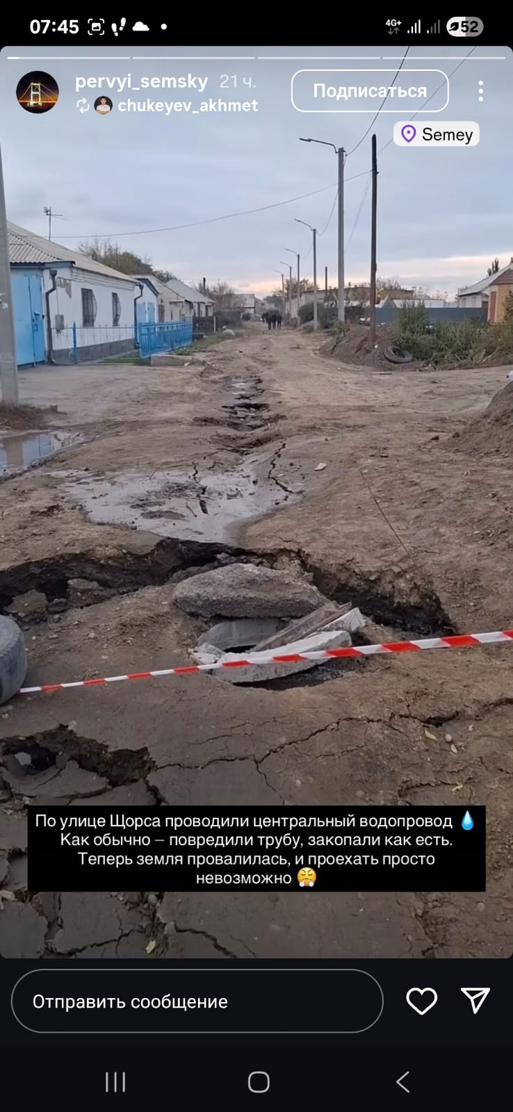 Кроме того, не так давно в Instagram городской активист Ахмет Чукеев публиковал видео, где сообщал, что во время прокладки водопровода по улице Щорса рабочие повредили трубу, но закопали траншею как есть. По словам автора, после этого посреди дороги просела земля, и образовалась глубокая яма, мешающая проезду.