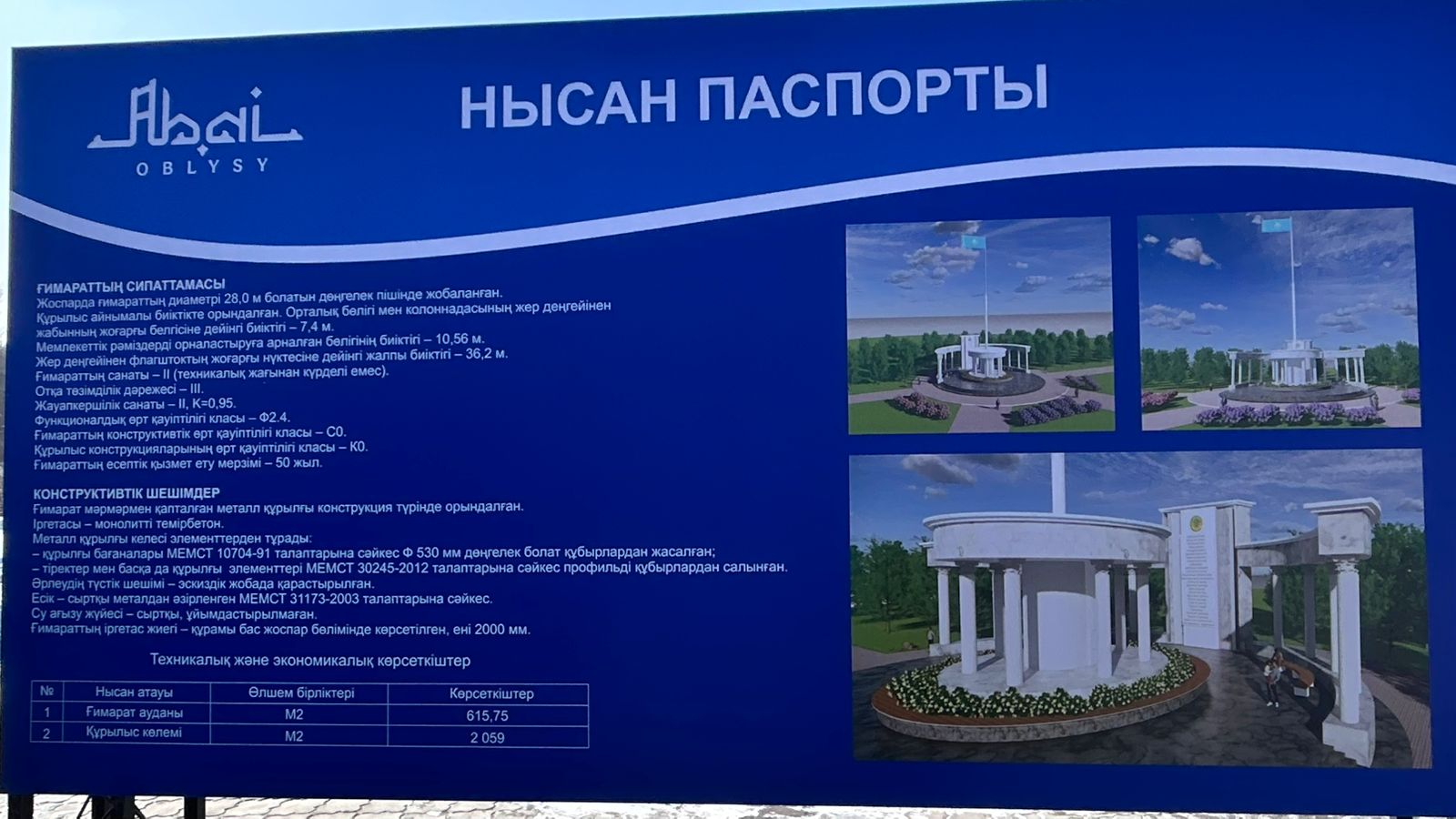 Рәміздер алаңы диамері 28.0 метр болатын дөңгелек пішінде жобаланған, құрылысы айналымы биіктікте орындалады. Жиында бұдан бөлек Бейбітшілік аралында аумағы 56 гектарды құрайтын экологиялық саябақ салу жоспары да айтылды.