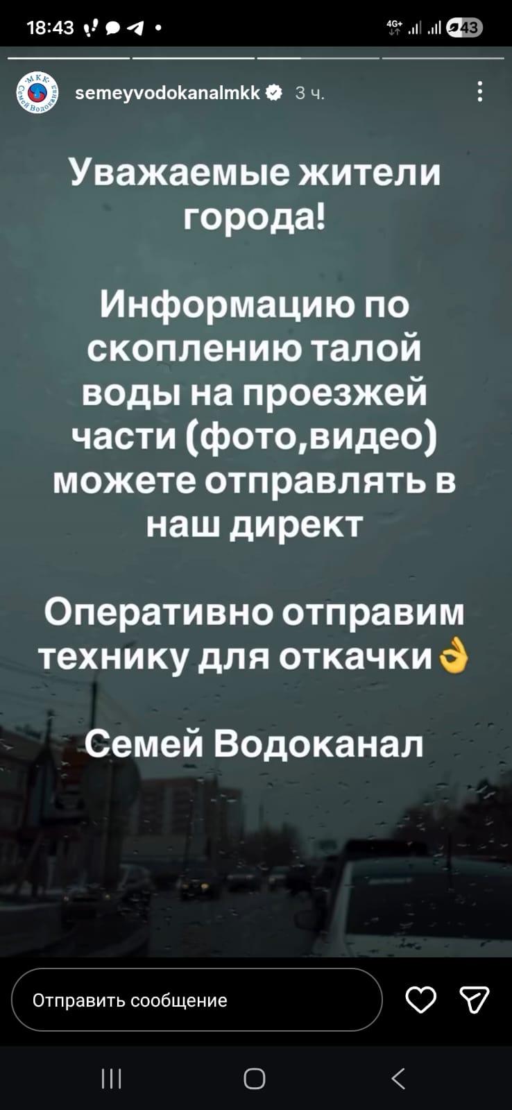 По поводу паводковой ситуации к горожанам обратился и "Семей Водоканал". Предприятие призвало отправлять в директ в Instagram-аккаунт информацию о скоплении талой воды на проезжей части. Пообещали оперативно отправлять технику для откачки.